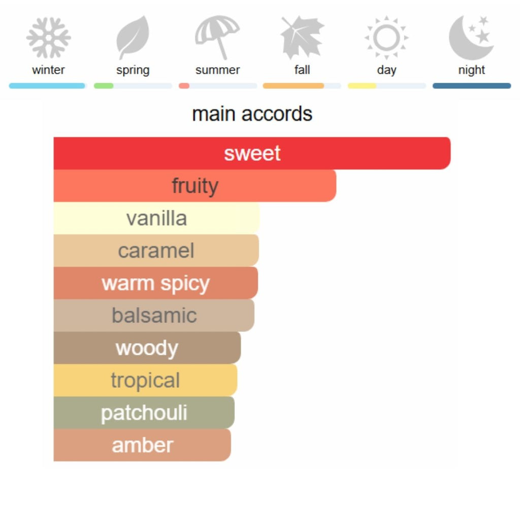 Базови нотки: пралина, карамел, личи, ванилия, пачули, тамян, кафе, женско биле, кумарин и папирус