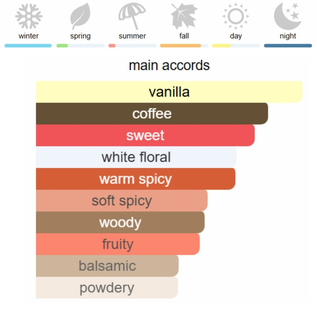 Базови нотки: ванилия, пачули, кашмирово дърво и кедър.