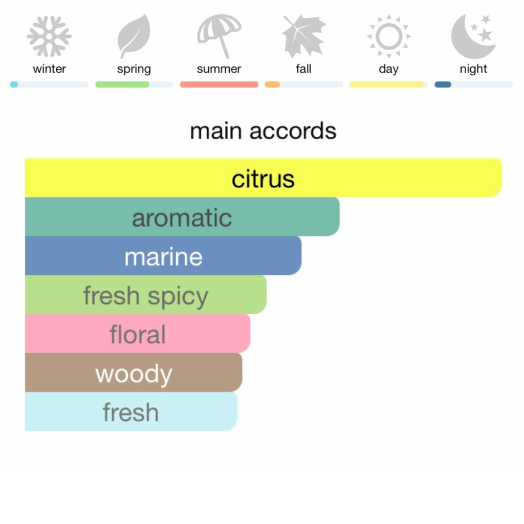 Връхни нотки: лайм, лимон, бергамот, жасмин, портокал, мандарина и нероли;