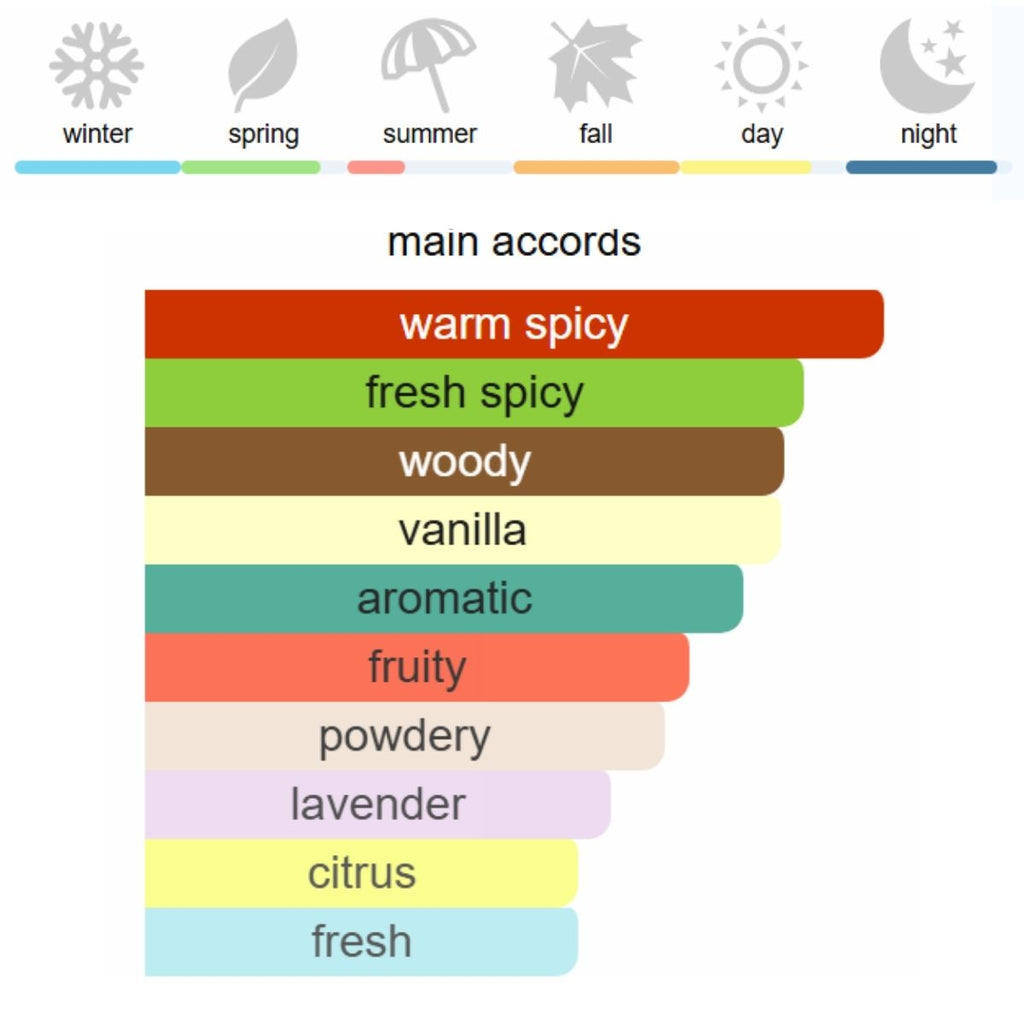 Базови нотки: ванилия, кардамон, сандалово дърво, пипер, гваяково дърво и пачули