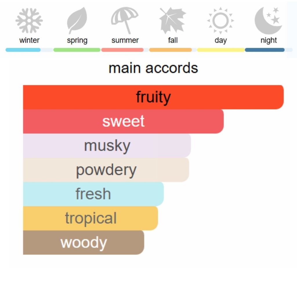 Базови нотки: мускус, сандалово дърво, ванилия, пачули и хелиотроп