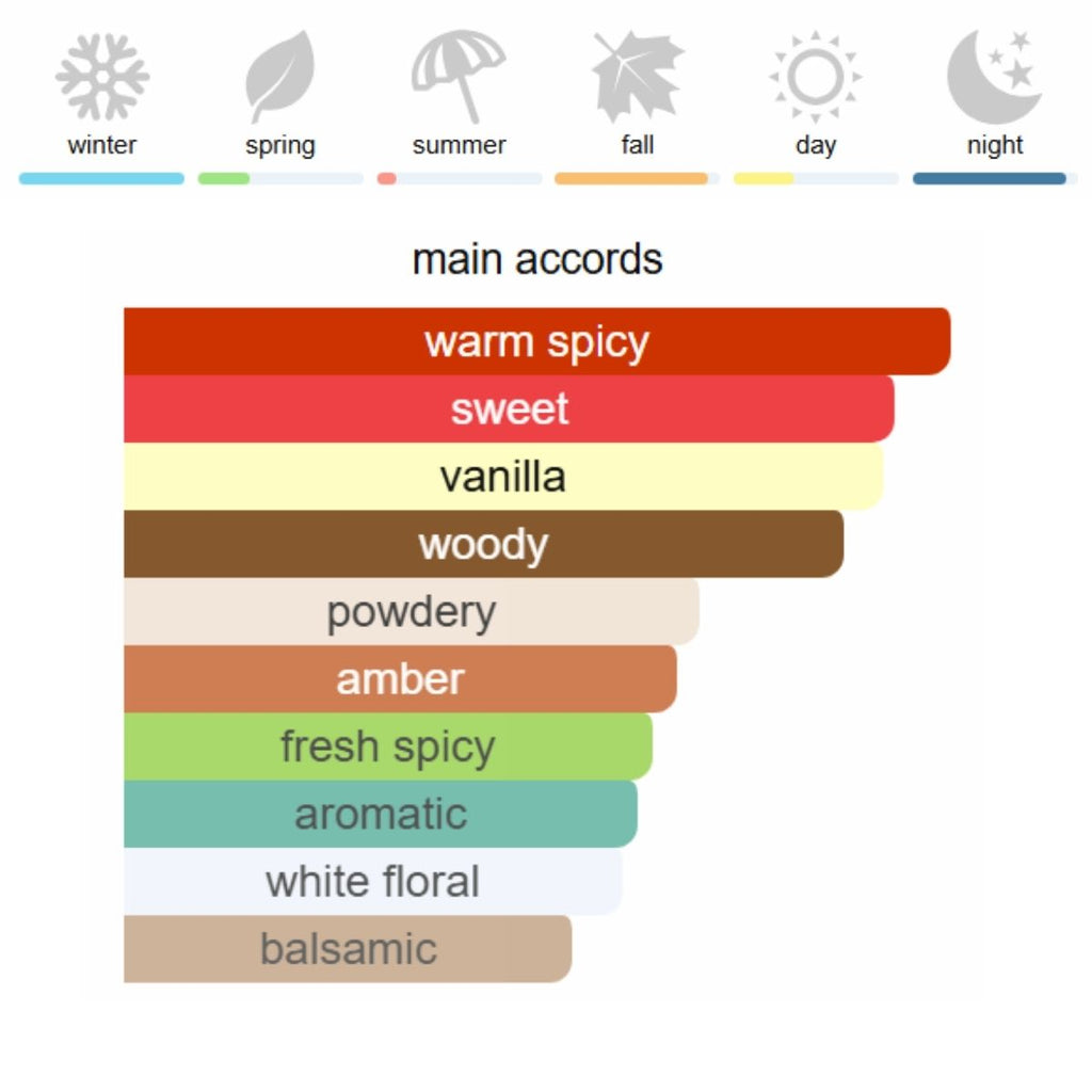Базови нотки: ванилия, амбра, дървесни нотки и сандалово дърво