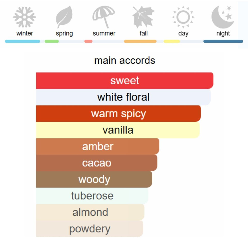 Базови нотки: тонка боб, какао, ванилия, пралине, сандалово дърво, мускус, амбра, кашмирено дърво, пачули, канела и кедър