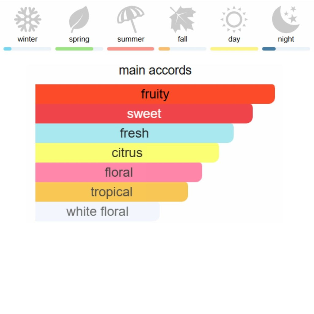 Връхни нотки: пасионфрут, грейпфрут, ананас, мандарина и голяма ягода