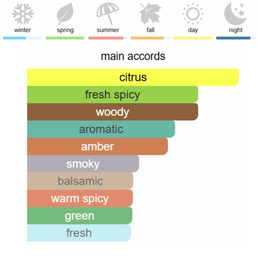 Базови нотки: тамян, ветивер, кедър, сандалово дърво, пачули, лабданум и бял мускус.