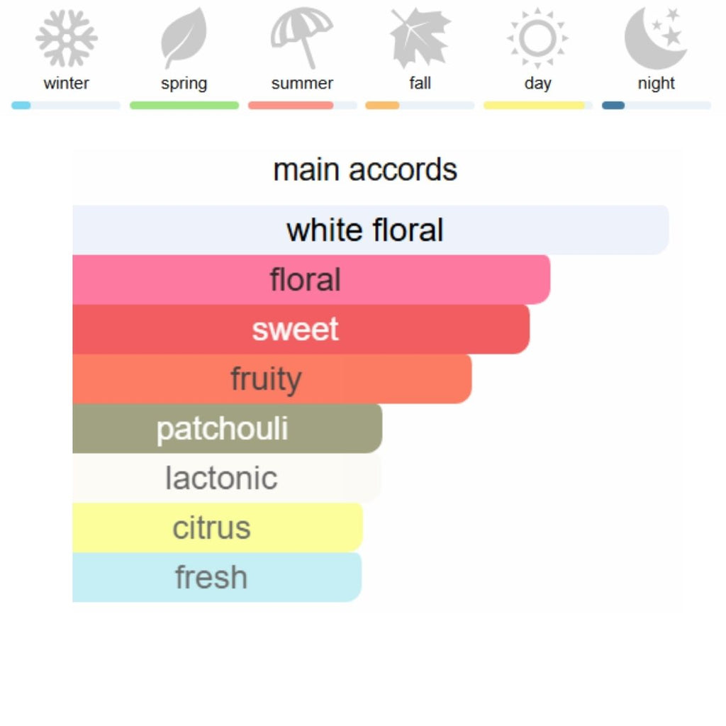 Този аромат е свеж и женствен, с изразени флорални и плодови нюанси, допълнени от сладка топлина.